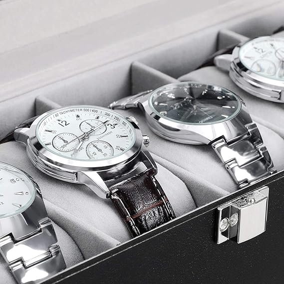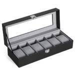Presents Luxury 6 Slot Watch Box for Men & Women Lockable Leather Watch Organizer with Glass Lid, Soft Velvet Cushions, Premium Display & Storage Case for Watches (Black)